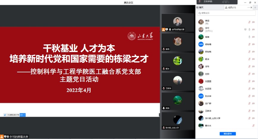 随后,医工融合系党支部委员谯旭领学了beat365在线唯一官网新冠肺炎疫情应急处置工作指挥部《关于进一步做好校园突发新冠肺炎疫情应急响应的工作措施》和《教育部、财政部、国家发展改革委联合召开新一轮“双一流”建设推进会》等文件。医工融合系党支部委员王新沛领学了《教育部长怀进鹏调研北京大学、清华大学:全面加强基础学科拔尖人才培养》文件要点,并解读了《beat365在线唯一官网“师生一家亲”互动小组行动方案》。随后,支部教师们对疫情防控和核酸检测、应对疫情网格化管理制度、“师生一家亲”互动小组行动细则、线上教学材料的完善、生物医学工程专业国际化、本科毕业设计中期考核、硕士学位论文盲审等工作进行了讨论。