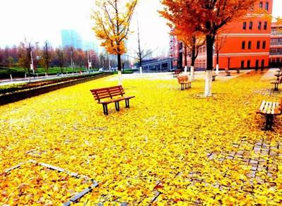 深秋霜后铺满树叶的白玉兰路
