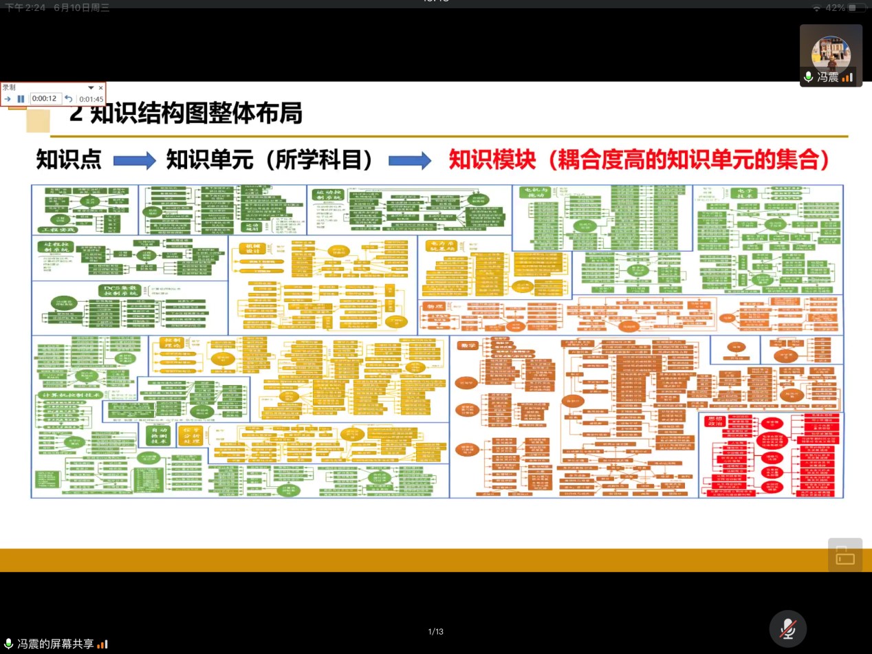 在本次决赛答辩中,队伍的答辩内容分为线上讲解展示环节以及评委点评提问环节。参加决赛的队伍以PPT和视频展示等形式进行知识框架总结讲解和思维导图设计应用展示。在答辩过程中,答辩队伍介绍了应用思维导图构建出的学科体系概况和依托实例仿真等多种形式体现的知识应用联系,并根据设计情况展现特点和创新点,表现出独到的见解与想法,也向评委老师展示了控院学子刻苦钻研、积极向上的精神风貌。在各队伍提问环节中,评委老师们结合理论与实践对同学们所展示的知识概括应用理解做出点评并提出疑问,让同学们对理论知识有了更深入透彻的理解,也帮助同学们将专业知识更好地应用于未来的学习研究中。在12支队伍全部答辩完毕后,各位评委老师做出总结,高度赞扬了本科毕业年级对本次比赛的热情与用心,鼓励同学们在日后的生活中常进行总结概括,坚持专业学习,不断完善自我,同时也表达了老师对同学们的想念。至此,本场决赛答辩会议圆满落下帷幕。