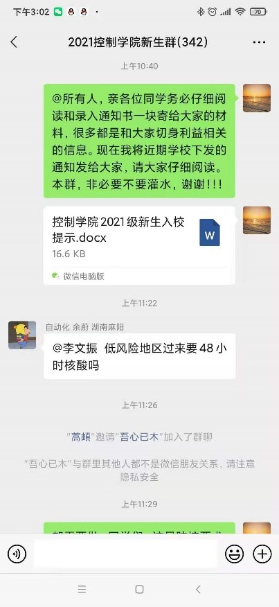经过大家的努力,成功了建立了学院2021级新生群,及时给全体新生发送学校相关的信息及通知,更是落实全心全意服务学生宗旨的具体体现。