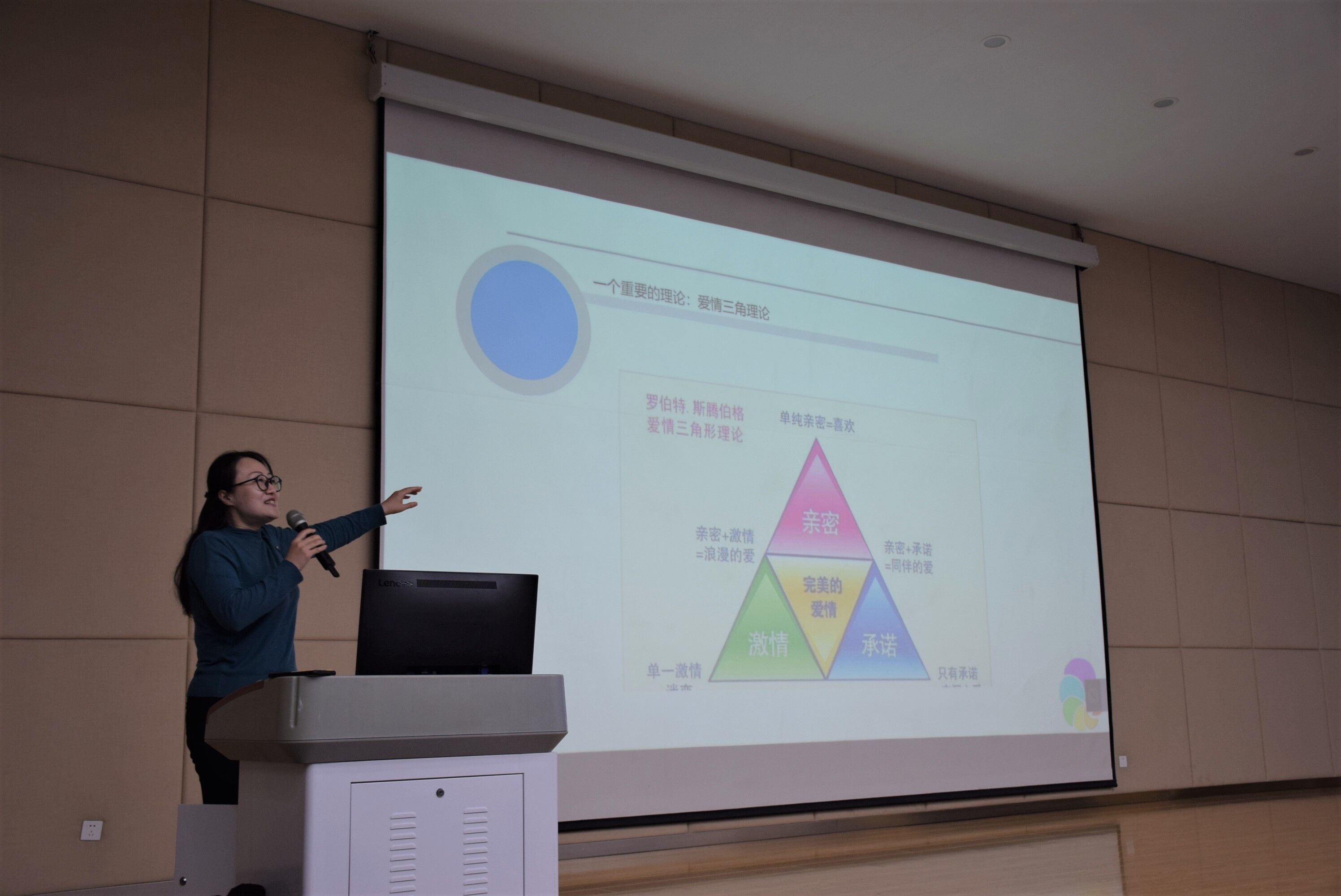 活动伊始,刘倩倩以简单的互动提问环节引入主题,引导同学们思考。刘倩倩由“金星人与火星人为何不同”起讲,从 “父亲身份不确定性假设”等现代理论追溯到原始社会男女分工的不同,深入浅出地向同学们解释了男性和女性之间的差异。紧接着,刘倩倩从“当两人遇到挫折”、“当两人相爱”等案例切入,就男性与女性在相同情况下的不同处理方法展开讲解,点明异性之间相处的正确方式。随后,刘倩倩以“那些不可言说的秘密”为主题,展开讲座的第三部分,讲解了爱情中安全感的来源,进一步强调正确恋爱观的重要性与恋爱中的注意事项。
