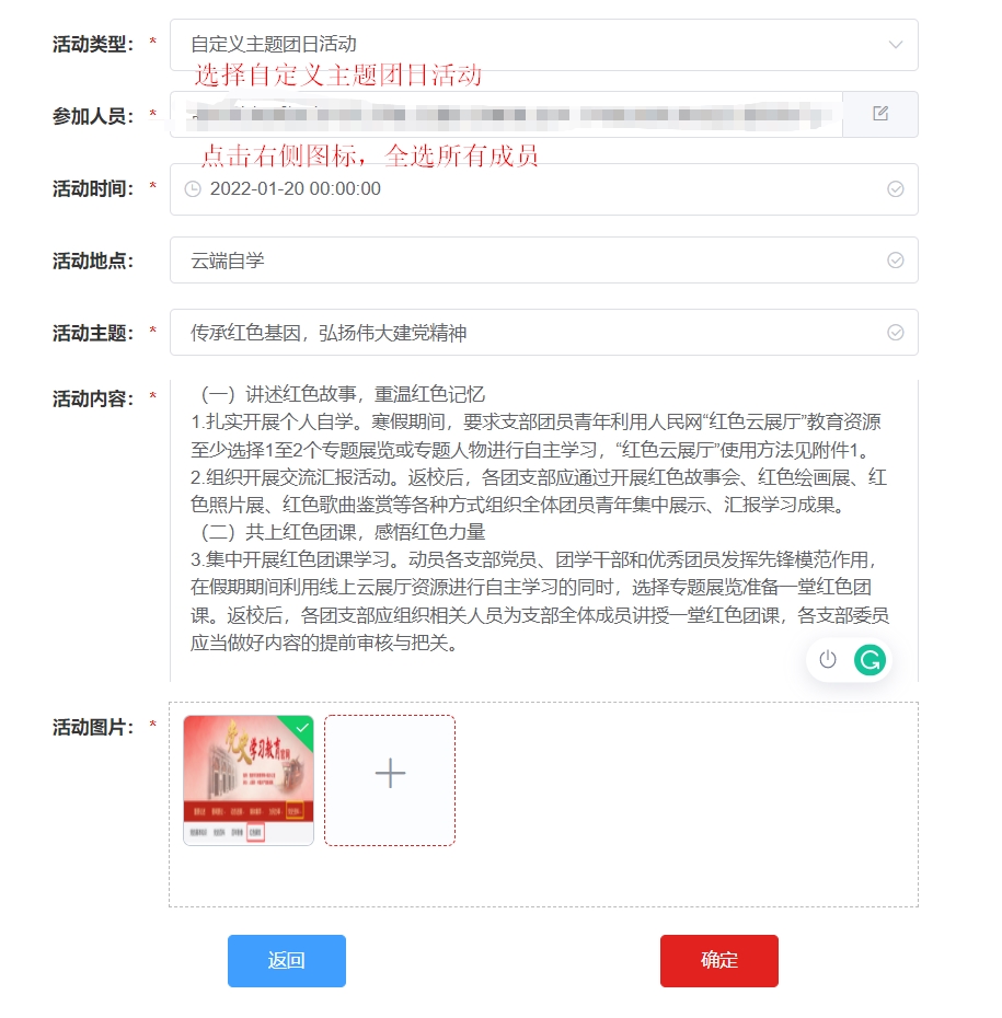 3.根据活动情况录入自定义主题团日活动。