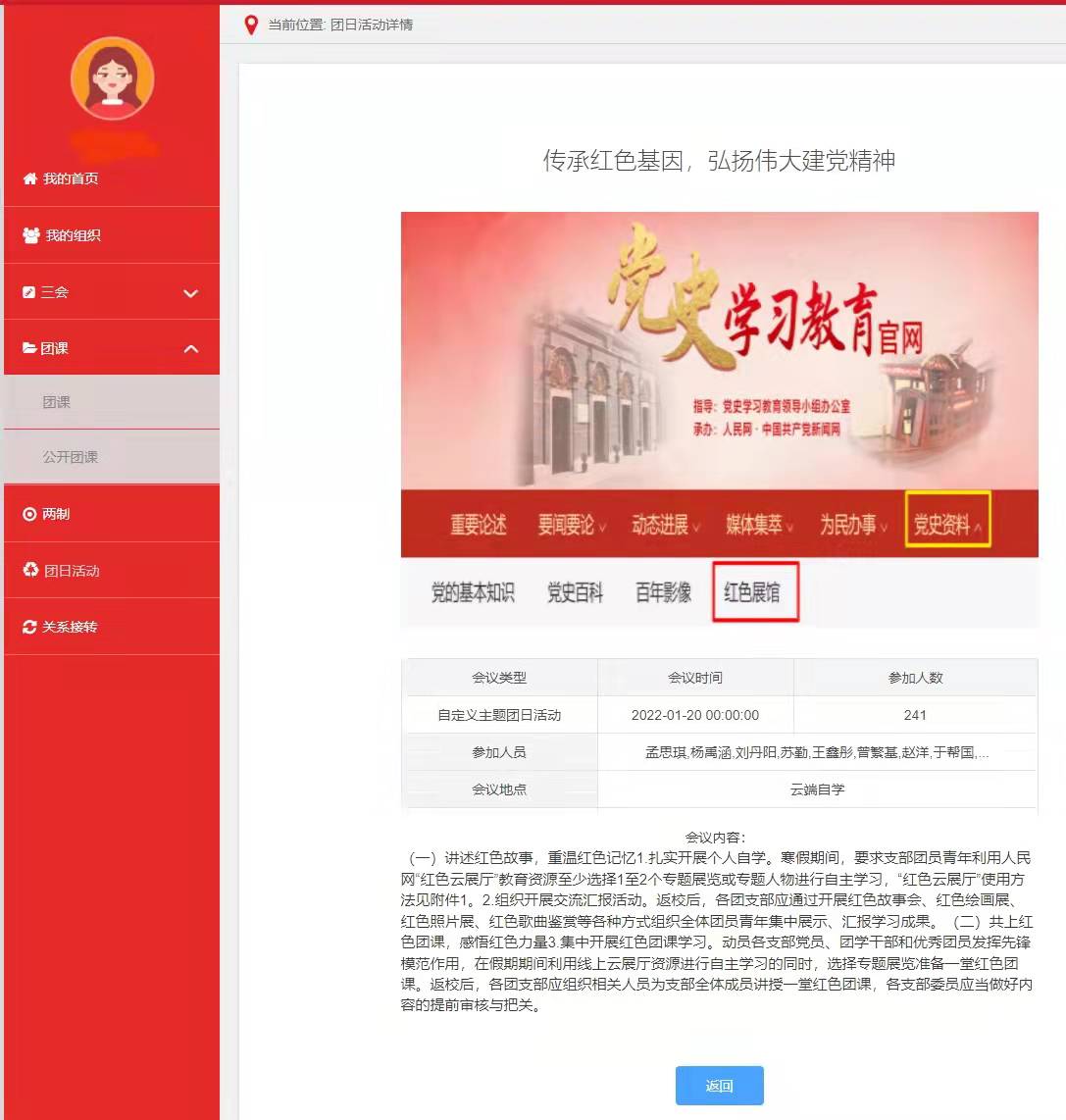 4.点击确定发布成功后,团员即可登陆智慧团建系统查看团日活动内容。