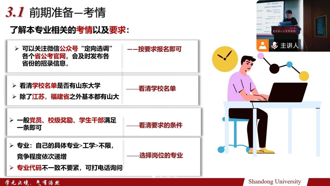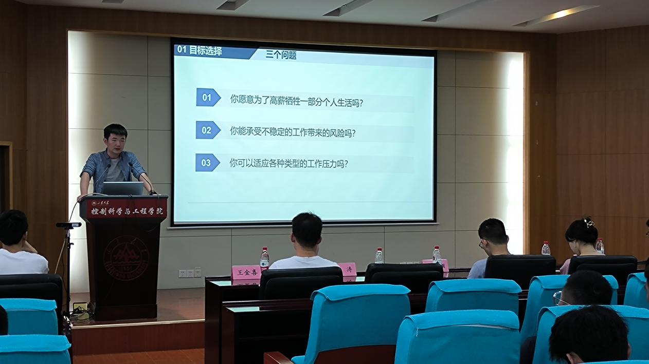 王金喜就“海外博士申请”主题,从申请前、申请中、申请后三个方面为同学们进行了规划和指导。申请前的准备,包括中英文成绩单、申请意向(国别、方向、学校和导师等)、资料准备(个人简历、语言水平等)以及奖学金来源。在申请过程中,要注意的方面包括了解导师、申请时间线以及面试准备等。在收到offer后,要定期和导师保持联系,了解以后的研究内容,并对Ph.D.生涯做一个规划。徐涛、夏英翔和赵畅就互联网企业、研究所以及国企求职经验,分别进行了详细的介绍。徐涛建议,求职中可以依托自己实验室的研究方向,介绍自己所扮演的角色以及所做的工作和所用的技能,从而展示自己的优势和特色。夏英翔凭借自己的海投经验和具备的技能,从了解市场需求、根据需求做简历、投递简历、面试、心态、工资以及礼貌的拒绝等方面进行了详细的分享。赵畅则针对女生求职方面,从树立信心、跟同专业的同学深入交流互相支持、做好每次进度追踪等方面为大家进行了细致入微的解答。赵宇航从报考指南、考试内容、考前准备、备考时间线等为大家带来了详细的公职考试类备考经验,他建议有报考想法的同学要做到细致认真地备考,要有清晰的自我认识,并且保持良好的心态,不要轻言放弃。