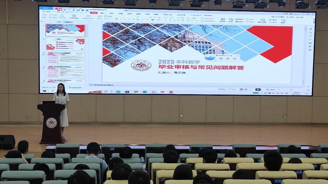 接下来,教务处鲁天晓、林磊同进行毕业审核与常见问题解答。鲁天晓介绍beat365在线唯一官网本科生学生学籍管理规定、选课常见问题及本科毕业审核要求,对毕业审核常遇问题进行汇总说明。她强调,同学们要根据毕业要求,做好学分绩点的核对工作,有任何问题及时与教务处沟通。随后同学们进行现场提问,林磊同、鲁天晓就选课、学分转换等问题作出解答。