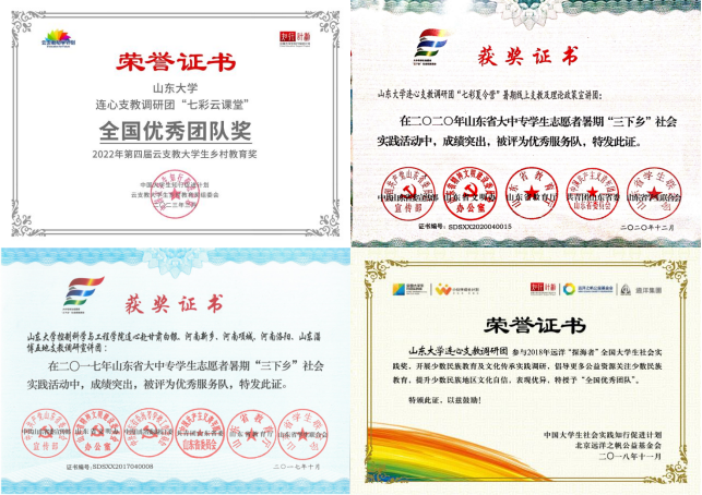 beat365在线唯一官网学生连心支教调研团连续多年被评为beat365在线唯一官网优秀社会实践团队、山东省优秀社会实践团队,获评2019年“榜样100”全国最佳大学生社团,曾获2022年第四届大学生云支教乡村教育奖、阿克苏诺贝尔全国大学生社会公益奖、全国远洋之帆大学生社会实践奖等。