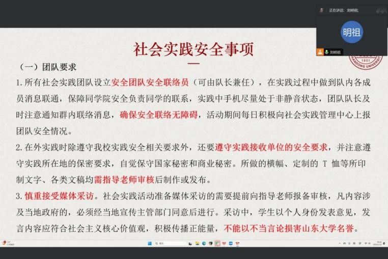 会议伊始,林星乐详细介绍了社会实践推文与新闻稿件要求。他强调,微信公众号推文稿件要突出实践活动的重点和特色,内容真实客观,语言简洁明了。同时,新闻应注重时效性,及时报道实践活动的进展和成果。在格式方面,林星乐对标题、正文、图片等都做出具体说明。随后,刘明祖再次跟大家重申了社会实践的主题选项,方便大家对社会实践有更清晰的行动方向。他向新生着重介绍了“青鸟计划”专项内容,指出“青鸟计划” 是山东团省委和省人力资源保障厅联合学校和有关地方部门服务学生成长就业、助力招才引智而实施的一项重要举措。通过参与“青鸟计划”,大家可以深入了解山东地区的发展需求,积累实践经验,拓宽就业渠道,为未来的职业发展打下坚实的基础。此外,刘明祖还重点强调了寒假社会实践的安全注意事项,提醒同学们在实践过程中要时刻保持高度的安全警觉,注意人身安全、财产安全和交通安全等,切实遵守实践单位的规章制度,听从队伍集体安排,做到风险防范。