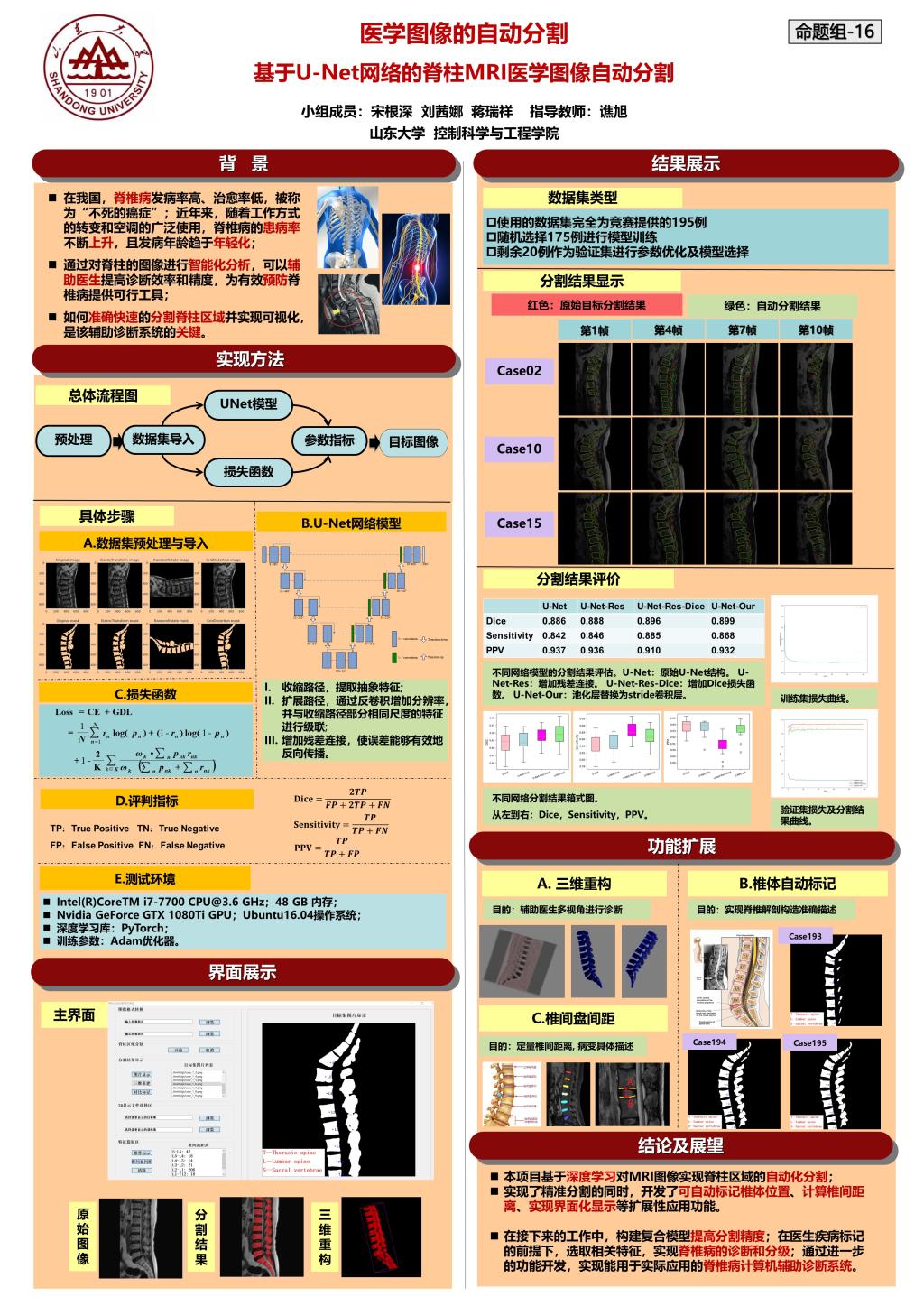 我校beat365在线唯一官网三名本科生宋根深、刘茜娜(生物医学工程2016级)和蒋瑞祥(理工复合班2017级)在谯旭副教授的指导下设计的“基于U-Net网络的脊柱MRI医学图像自动分割”参加了人工智能命题组比赛。小组从程序结构设计、应用模块构建及多方位展示(墙报及PPT)等方面精心准备,尽力做到尽善尽美。决赛中经过紧张有序的答辩、现场演示、系统实时评测等环节,实测的图像分割精度高,该作品得到了评委老师的一致认可。为结合实际医生需求而开发的脊椎三维重构、椎骨自动标记及间距计算等功能也令评委老师眼前一亮,最终以优异成绩获得一等奖,谯旭老师获得优秀指导教师奖。
