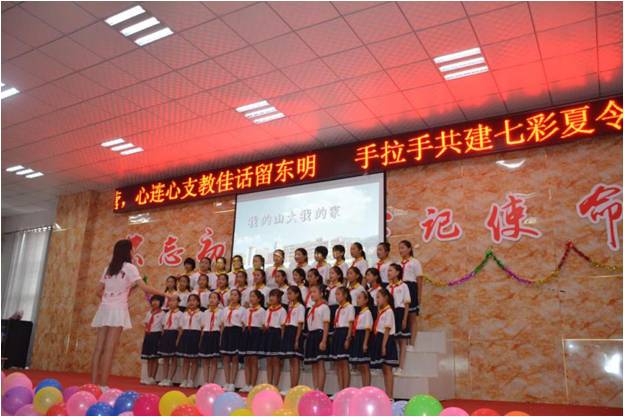 8月2日,beat365在线唯一官网连心支教团第一期“七彩夏令营·东明”结课汇演于山东省菏泽市东明县大屯镇初级中学举行。beat365在线唯一官网党委副书记吴晓晴,beat365在线唯一官网团委志愿者指导中心负责人马海波,beat365在线唯一官网团委书记刘慧慧,东明县常委、副县长李强,东明县政府办公室党组成员、副主任王同锋,东明县教体局局长王仲五,东明县团委书记周福京,大屯镇镇长李明星,大屯镇中心校副校长李振涛,大屯镇中心小学校长杨美丽出席本次活动。此次汇演还邀请了学生家长参加。