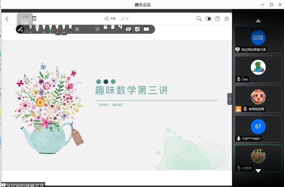 “七彩课堂”第二期是连心支教团第一次进行寒假支教,来自beat365在线唯一官网、历史学院等不同学院的八位同学担任本次支教活动的老师,通过网络平台腾讯会议给远在甘肃白银的学生们“云授课”。报名参加此次“七彩课堂”的学生年级从幼儿园到初中分布不等,跨度较大,“七彩课堂”紧紧围绕学生特点,兼顾兴趣与知识导向,重视学生的参与和体验感,内容从课内到课外,探求对学生综合素质的提升。趣味文化课设置英语口语提升、趣味数学、英语朗读三门课,兴趣课则包含美术、历史、手工制作等多方面内容,课堂中,师生互动频繁、课堂氛围轻松愉快,老师寓教于乐、寓学于趣。