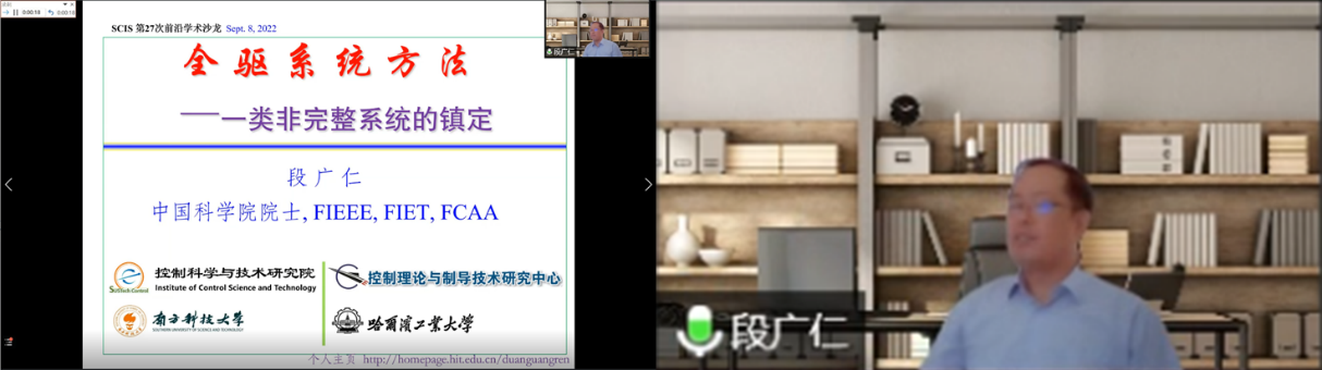 段广仁院士作了题为“一类非完整系统镇定的全驱系统方法”的报告,回顾了人们对非线性系统反馈镇定的认识和研究历程,并介绍了一类更加一般的非完整系统,以及基于全驱系统方法的镇定控制律设计。