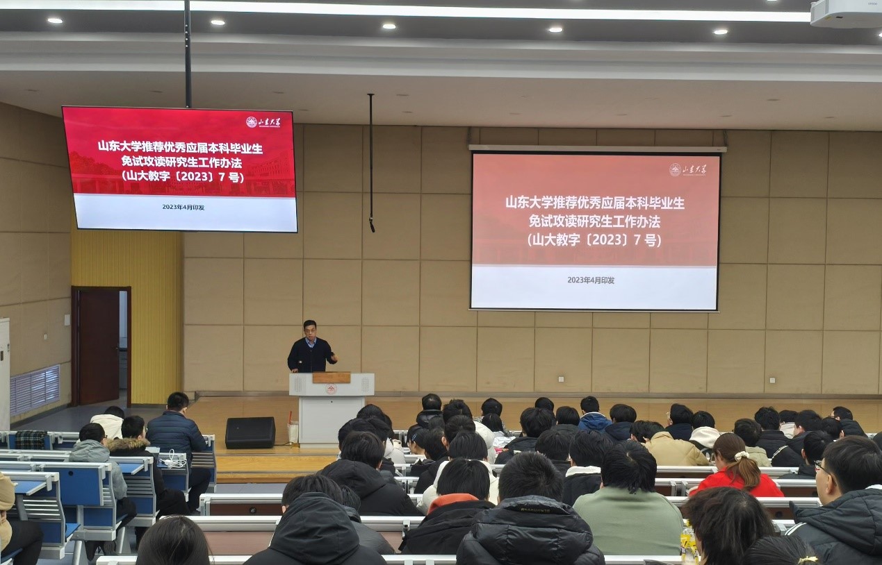 朱文兴结合习近平新时代中国特色社会主义思想以及新时代教育评价改革精神和立德树人根本任务,全面深入解读了《beat365在线唯一官网推荐优秀应届本科毕业生免试攻读研究生工作办法(山大教字〔2023〕7号)》,重点说明了推免排名方法、推免资格要求、推免生名额计划分配、推荐办法等学生高度关注的核心条款,并对下一届优秀毕业生推免遴选阶段的工作流程和大致时间节点做了相关介绍。他强调,各位同学一定要熟悉课程属性,认真核对专业培养方案与教务系统教学执行计划,提前做好自身学习规划,切实保障学业成绩满足和达到修读要求。
