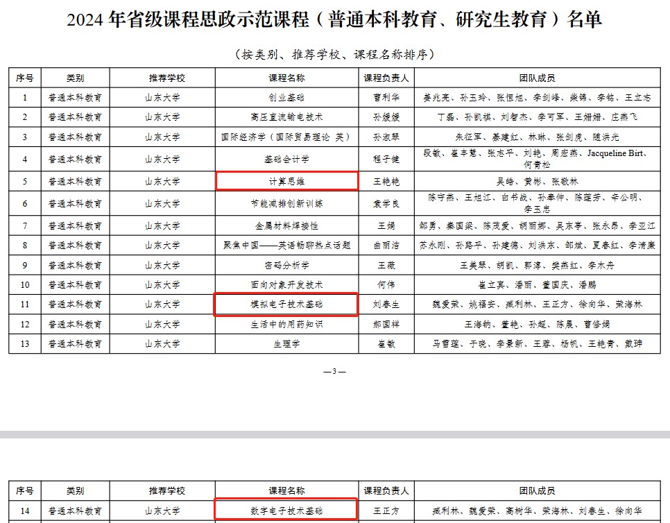 近日,山东省教育厅公布了2024年省级课程思政示范课程(普通本科教育、研究生教育)名单,beat365在线唯一官网《计算思维》《模拟电子技术基础》《数字电子技术基础》获评山东省课程思政示范课程。目前,beat365在线唯一官网共建设国家级课程思政示范课程1门、山东省课程思政示范课程7门、beat365在线唯一官网课程思政示范课程14门。